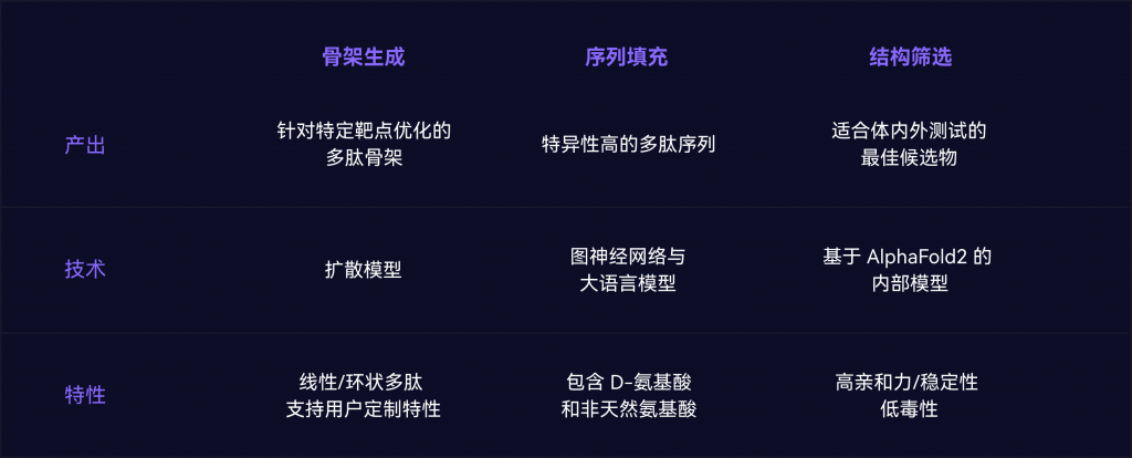 PepiX 的 AI 模型協同運作,實現肽主鏈生成、序列完善及功能預測。