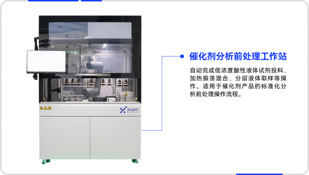晶泰科技研發(fā)的催化劑分析前處理工作站,可自動(dòng)完成低濃度酸性液體試劑投料、加熱振蕩混合、分層液體取樣等操作。適用于催化劑產(chǎn)品的標(biāo)準(zhǔn)化分析前處理操作流程。機(jī)器人精準(zhǔn)控制,操作標(biāo)準(zhǔn)化,避免人為錯(cuò)誤,提升實(shí)驗(yàn)通量,提高產(chǎn)品分析效率。